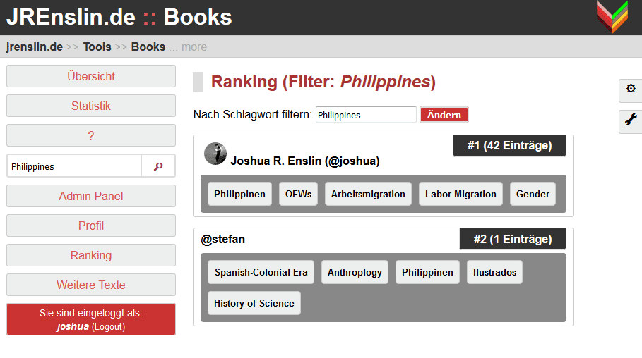 A second notable function is the "ranking" function. Using this, users can find other users - ranked by how many texts they added to their account on a given topic (say, which have been tagged as being topical). Next to the ranked users those keywords will be shown, which most strongly correlate in the users reading with the one entered as a search term. For example, searching for the "Philippines", the tool will show that most texts on the Philippines I read also dealt with labor migration and gender. This tool is aimed at pushing better communication and further collaboration outside of the context of the Books tool.