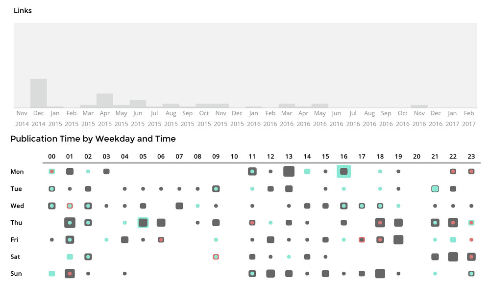 Important in doing the heatmap was to use logarithm functions to flatten the statistics. Initially, I simply computed percentages out of the numbers of posts at a given time. This however either led to times were there was only a single post of a given type to be almost unnoticeable or to those times when I posted many things of the same type to overstep their boundaries. By flattening the numbers, differences in size are still distinguishable while even smaller numbers remains clearly visible.